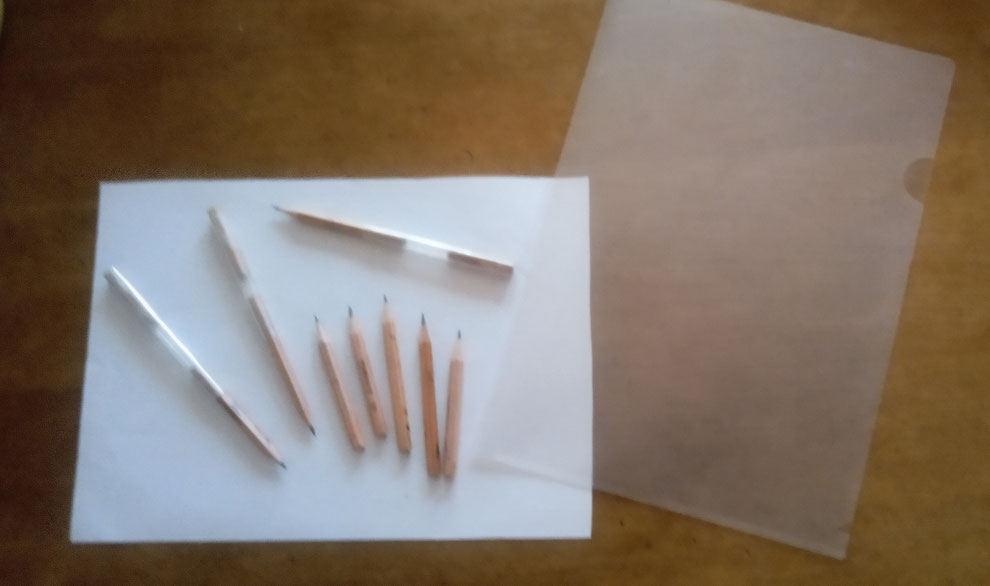 クリアファイルを適当に切って鉛筆の太さの筒にし、セロテープでしっかり固定する。